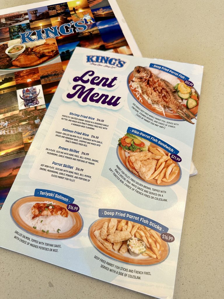 グアム発のファミリーレストラン、キングス(Kings)は、グアムの人たちの嗜好を熟知したメニューを多く揃える人気レストラン。もちろん、多くのカトリック教徒に配慮し、シーフードを中心としたレントメニューが充実。