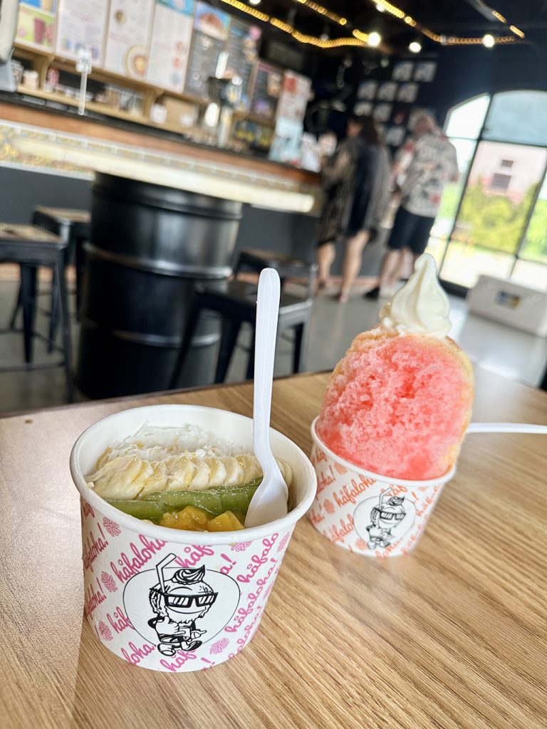 注文していたかき氷とアサイボウルが出来上がりました。常夏グアムでは1年中冷たいスイーツやドリンクがおいしく楽しめます。