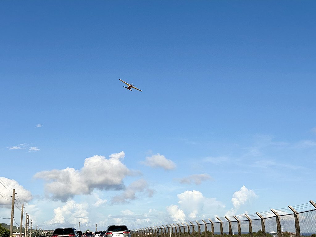 民間旅客機だけでなく、オプショナルツアーのセスナ機やスカイダイビングの飛行機などもグアム国際空港内の一部エリアを利用しているので、空港周辺で見ることができます。上写真はセスナ機のようです。